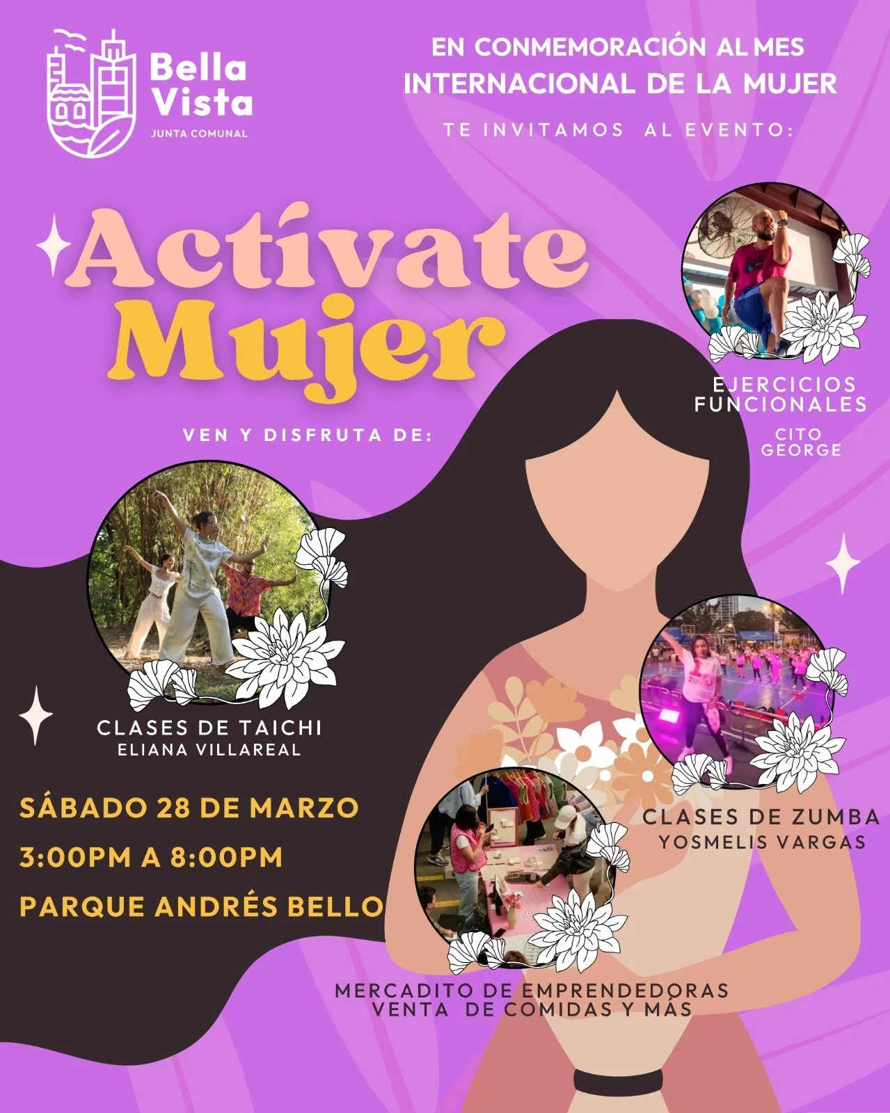 En la Junta Comunal de Bella Vista, creemos firmemente en el poder, la salud y el emprendimiento femenino. Por eso, en conmemoración al Mes Internacional de la Mujer, hemos preparado una tarde muy especial diseñada exclusivamente para que te desconectes de la rutina y te conectes contigo misma. El evento "Actívate Mujer" es más que una tarde de ejercicios; es un espacio de encuentro para disfrutar al aire libre, apoyar el talento local y fortalecer nuestro bienestar físico y mental.